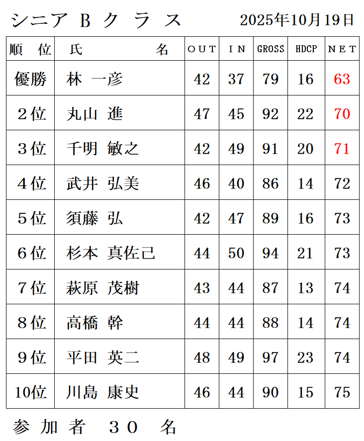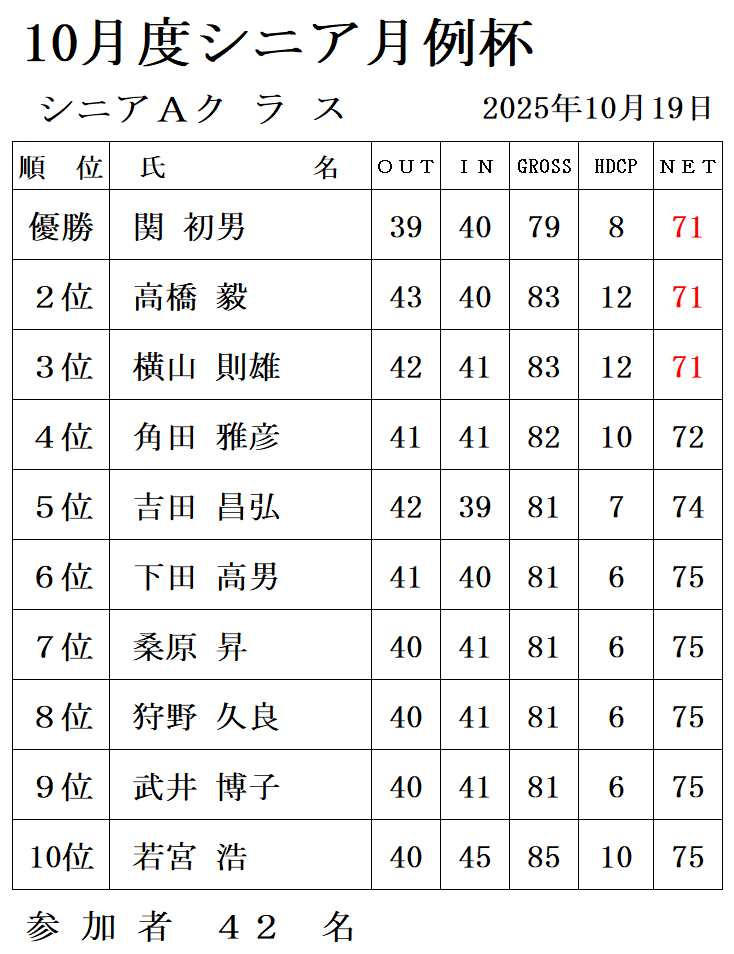 10月度シニア月例杯【結果】 投稿日:25/10/20 2025年10月19日(日) シニア月例杯が開催されました。 【月例杯‐シニア】 Aクラス 優勝 関 初男さん 準優勝 高橋 毅さん 3位 横山 則雄さん Bクラス 優勝 林 一彦さん 準優勝 丸山 進さん 3位 千明 敏之さん