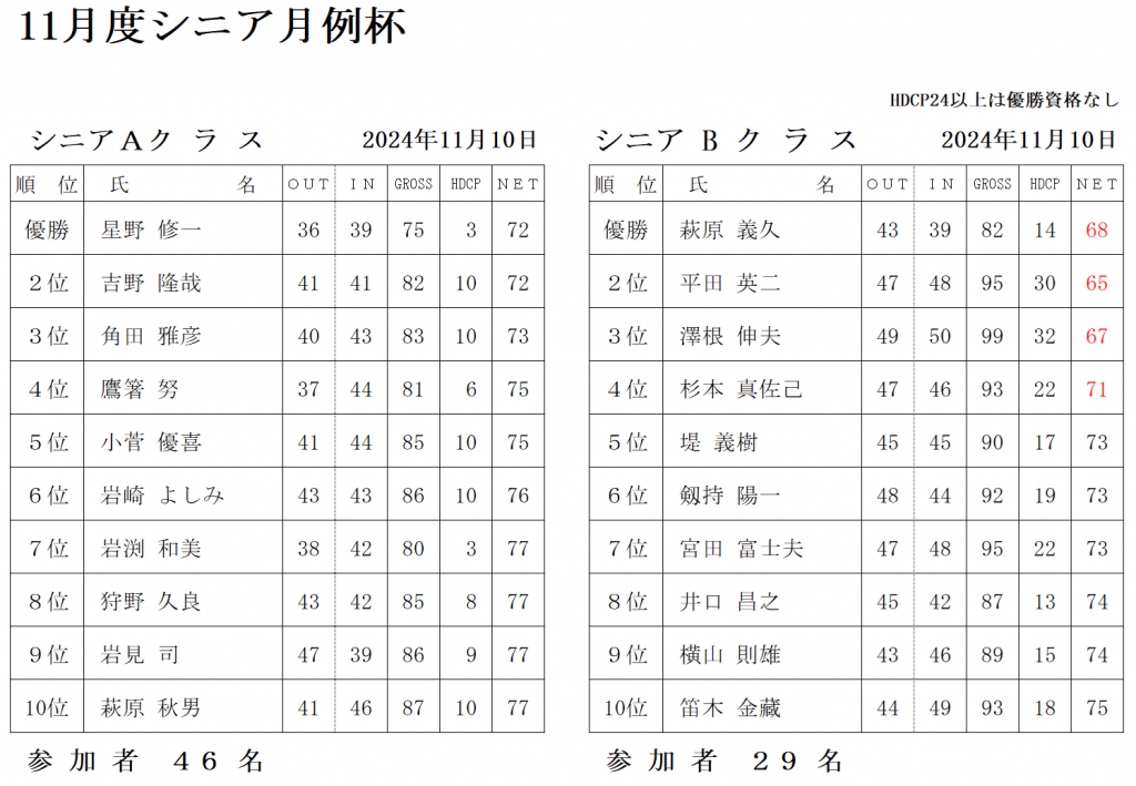 10月度シニア月例杯【結果】 投稿日:25/10/20 2025年10月19日(日) シニア月例杯が開催されました。 【月例杯‐シニア】 Aクラス 優勝 関 初男さん 準優勝 高橋 毅さん 3位 横山 則雄さん Bクラス 優勝 林 一彦さん 準優勝 丸山 進さん 3位 千明 敏之さん